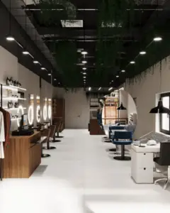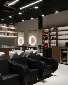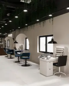 Il controsoffitto tecnico, lasciato volutamente a vista, viene ammorbidito da un fitto verde sospeso che dona ritmo e verticalità allo spazio. Le postazioni make-up illuminate a luce circolare garantiscono precisione e qualità visiva, mentre la zona nails e color, caratterizzata da arredi su misura e pannelli specchiati ad arco, aggiunge profondità e un’identità chiara al percorso esperienziale del cliente.