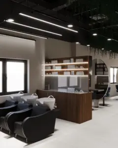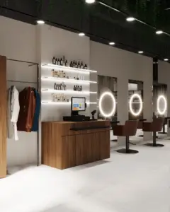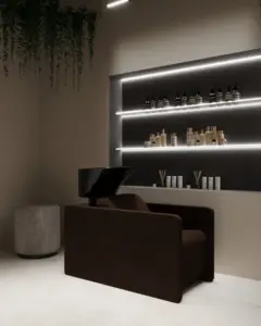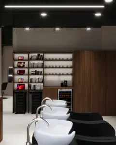 Un salone concepito come sequenza fluida di funzioni, dove estetica e haircare convivono in un ambiente contemporaneo e materico. La palette neutra si scalda grazie al legno, che definisce le postazioni e introduce una sensazione di comfort professionale.