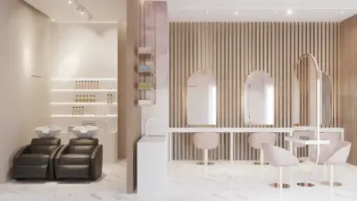 Un salone che interpreta la femminilità contemporanea attraverso un’estetica luminosa e sensoriale. Le superfici in marmo chiaro, i toni cipria e le finiture oro creano un ambiente etereo ma estremamente curato. Le partizioni verticali in listelli definiscono i percorsi senza interrompere la continuità visiva, mentre le postazioni con specchi ad arco richiamano un’eleganza delicata e iconica.