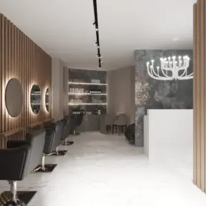 Uno spazio barber contemporaneo che combina matericità calda e carattere metropolitano. Le doghe in legno definiscono percorsi e profondità visive, creando un ritmo elegante che accompagna lo sguardo verso le postazioni illuminate da specchi circolari retroilluminati. Il grande chandelier scultoreo introduce un tocco iconico, mentre il pavimento in gres effetto marmo amplifica la luminosità. L’insieme genera un ambiente raffinato, ordinato e accogliente, dove estetica e funzionalità dialogano con equilibrio.