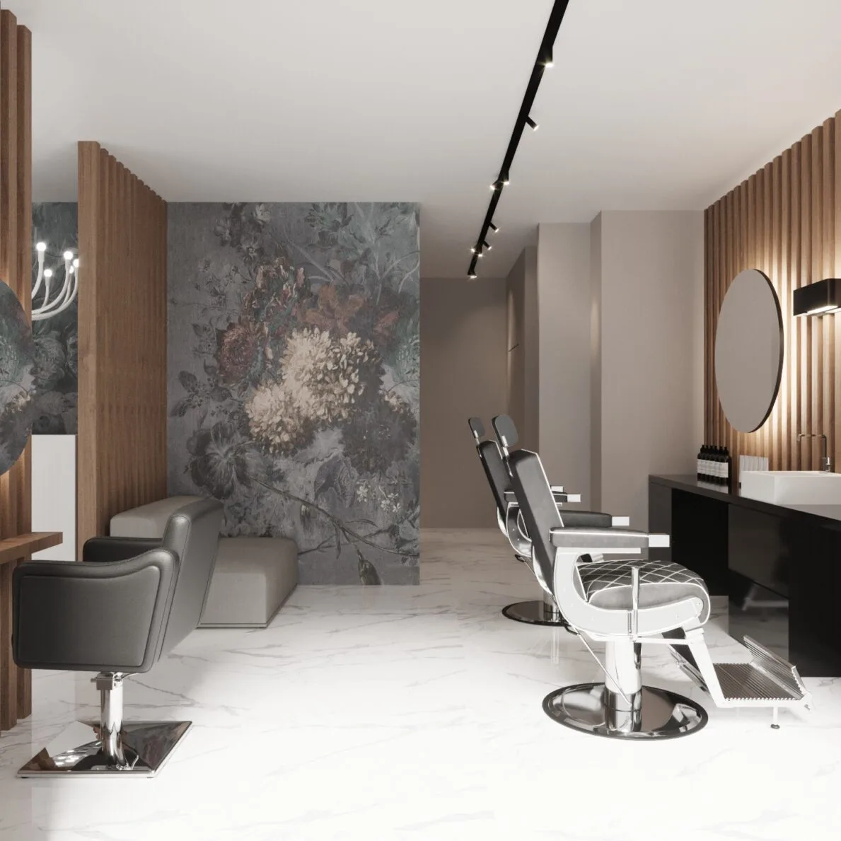 Uno spazio barber contemporaneo che combina matericità calda e carattere metropolitano. Le doghe in legno definiscono percorsi e profondità visive, creando un ritmo elegante che accompagna lo sguardo verso le postazioni illuminate da specchi circolari retroilluminati. Il grande chandelier scultoreo introduce un tocco iconico, mentre il pavimento in gres effetto marmo amplifica la luminosità. L’insieme genera un ambiente raffinato, ordinato e accogliente, dove estetica e funzionalità dialogano con equilibrio.