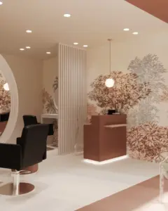 Le tonalità cipria e terra dialogano con il grande wall decor botanico, creando un’atmosfera rilassante e immersiva, mentre volumi essenziali e trasparenze calibrate mantengono il layout arioso e perfettamente funzionale. Le linee verticali filtrano lo spazio con discrezione, separando le aree operative senza interrompere la continuità visiva.