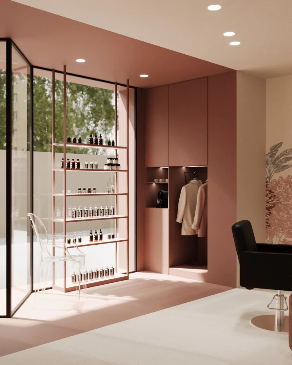 Le tonalità cipria e terra dialogano con il grande wall decor botanico, creando un’atmosfera rilassante e immersiva, mentre volumi essenziali e trasparenze calibrate mantengono il layout arioso e perfettamente funzionale. Le linee verticali filtrano lo spazio con discrezione, separando le aree operative senza interrompere la continuità visiva.