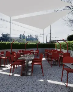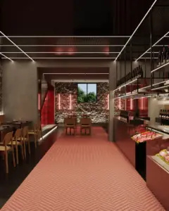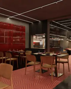 Il design di Pepe Rosso unisce atmosfera contemporanea e carattere deciso attraverso un uso audace del colore. Le superfici metalliche rosse, retroilluminate, creano un effetto scenografico che dialoga con la parete in pietra naturale, aggiungendo profondità e un’anima materica allo spazio. L’illuminazione lineare sul soffitto definisce prospettive pulite, mentre arredi essenziali in legno e dettagli neri completano un ambiente moderno, caldo e dall’identità fortemente riconoscibile.