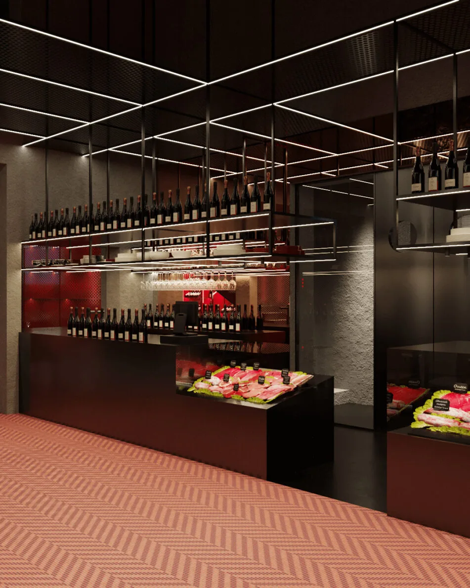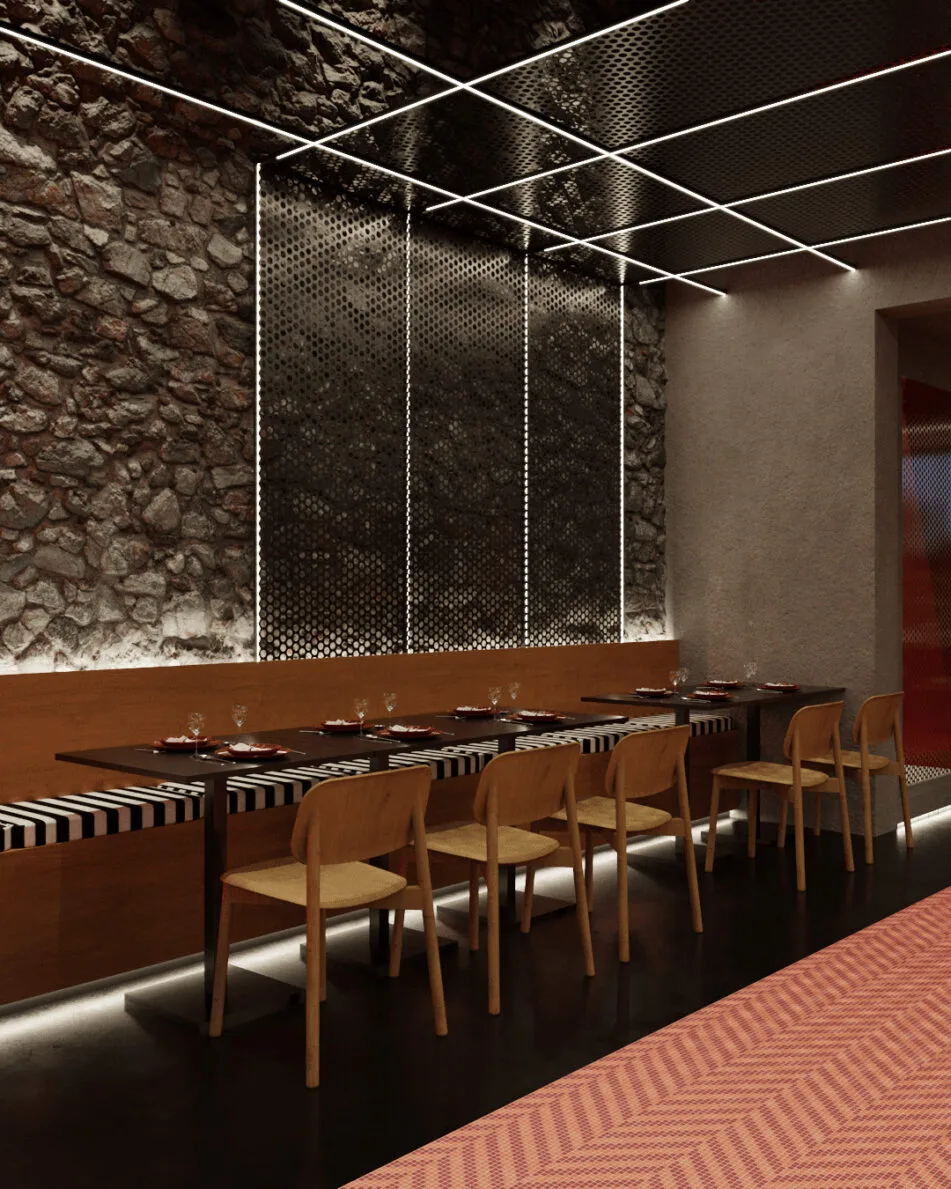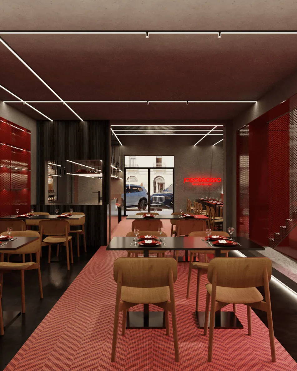 Il design di Pepe Rosso unisce atmosfera contemporanea e carattere deciso attraverso un uso audace del colore. Le superfici metalliche rosse, retroilluminate, creano un effetto scenografico che dialoga con la parete in pietra naturale, aggiungendo profondità e un’anima materica allo spazio. L’illuminazione lineare sul soffitto definisce prospettive pulite, mentre arredi essenziali in legno e dettagli neri completano un ambiente moderno, caldo e dall’identità fortemente riconoscibile.