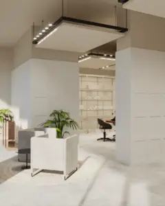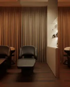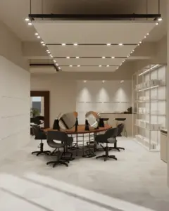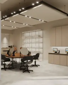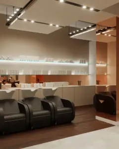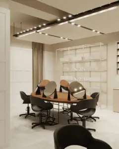 Uno spazio professionale e contemporaneo, organizzato attorno a un’ampia postazione centrale che favorisce condivisione e dinamismo. Le superfici neutre e la luce uniforme valorizzano le geometrie pulite, mentre gli specchi rotondi introducono un tocco iconico e scenografico. La zona tecnica, in continuità visiva con l’area styling, mantiene un’estetica ordinata e accogliente. Il risultato è un ambiente funzionale, equilibrato e studiato per offrire un’esperienza fluida e perfettamente armonizzata.